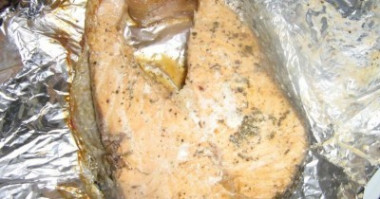 Выньте сёмгу из духового шкафа, дайте стейкам "отдохнуть" в течении пяти минут и лишь потом открывайте фольгу.