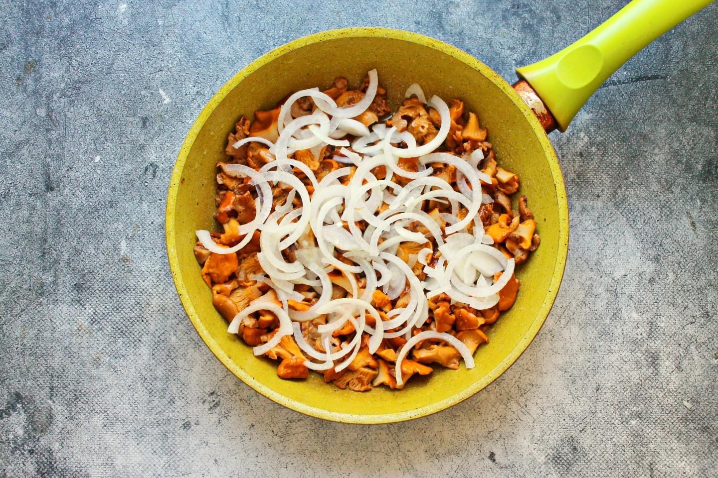 В сковороду налейте растительное масло и разогрейте на среднем огне. Как выбрать сковороду и масло для жарки можно прочитать в конце рецепта. Крупные лисички порежьте на кусочки, мелкие положите целиком и обжаривайте в течение 7-10 минут. Жидкость должна полностью выпариться. Репчатый лук порежьте полукольцами и отправьте на сковороду к лисичкам.