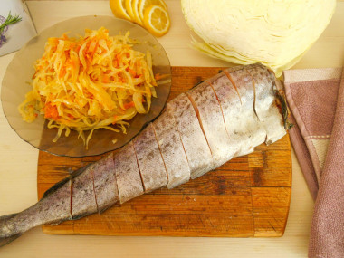 Возьмите лук и чеснок очистите от шелухи. Морковь помойте с щеткой под проточной водой, обсушите и очистите от кожуры. С капусты снимите верхние грязные листья, промойте под проточной водой, обсушите. Рыбу очистите от чешуи, отрежьте головы и хвостики, так же уберите плавники. Ополосните тушки под проточной водой, обсушите бумажными полотенцами и нарежьте на кусочки толщиной около 2-3 сантиметров.