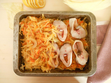 Возьмите форму для запекания, первым слоем выложите половину капусты, сверху выложите кусочки рыбы. Посыпьте их душистым или черным молотым перцем, сбрызните соком свежевыжатого лимона (по желанию) и слегка посолите.