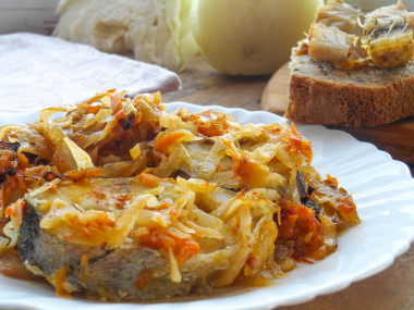 Рыба с капустой это идеальное сочетание! Именно по этому выбрала этот рецепт. Для начала потушила капусту с овощами и томатной пастой.Затем выложила капусту на противень и уложила очищенную рыбу, у меня минтай. Мне нравится эта рыба, она не дорогая и если правильно приготовить, то очень даже вкусная. Выложила завершающий слой капусты и в духовку. Через 40 минут всё было готово. Рыба получилась сочной, видимо капуста напитала её своим соком. Капуста, как дополнение к рыбке ароматная и мягкая.