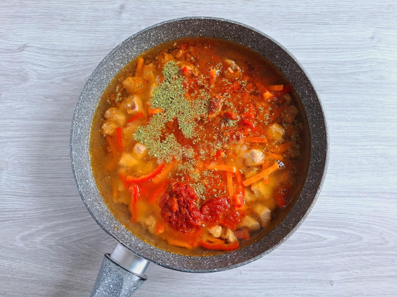 В сковороду влейте горячую воду, добавьте томатную пасту, паприку, сушеную зелень и перец. Посолите по вкусу и все перемешайте. Нагрев сделайте минимальным, сковороду неплотно накройте крышкой и тушите около 15-20 минут в зависимости от особенностей работы вашей плиты и готовности свинины. Мясо должно стать мягким. Воду лучше использовать нейтральную по вкусу фильтрованную или бутилированную. Вода из-под крана может придать блюду неприятный привкус.
