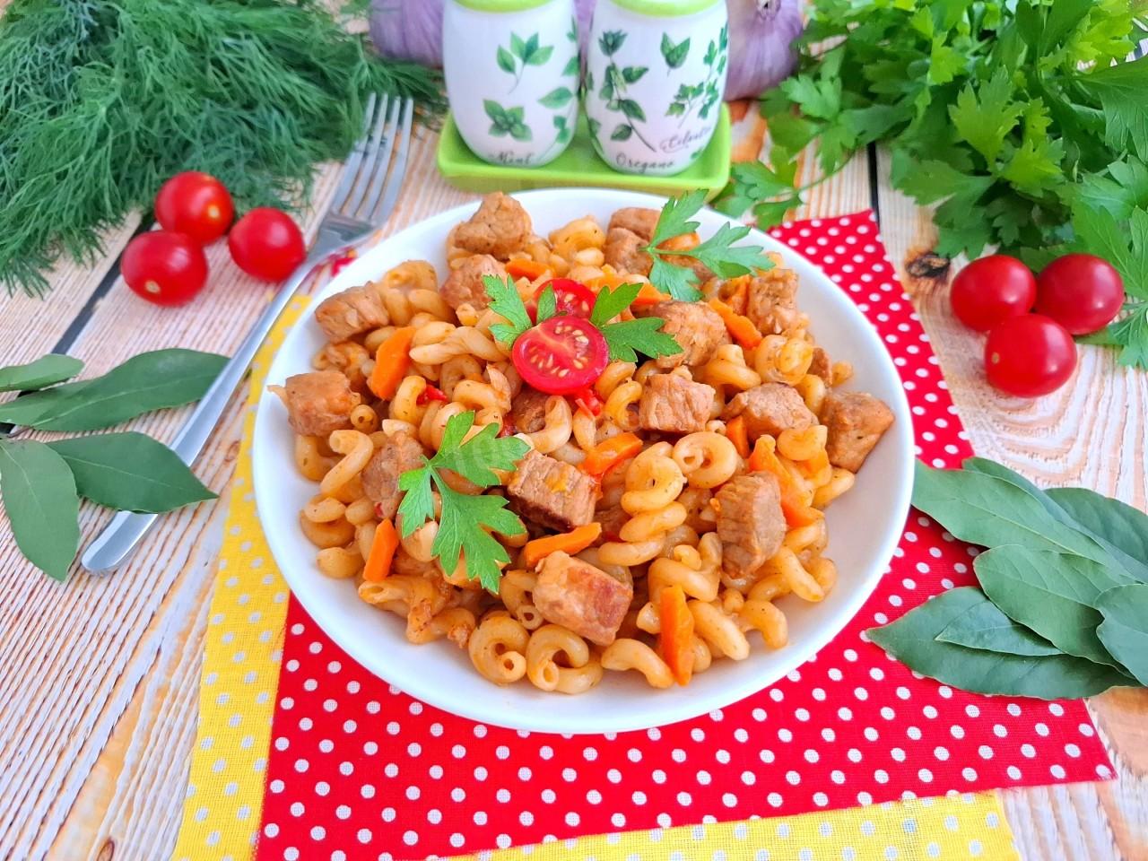 Макароны с мясом свинины подавайте в горячем виде, украсив зеленью. Дополнить блюдо можно свежими или маринованными овощами. Можете по желанию посыпать блюдо сверху тертым твердым сыром (например, пармезаном или чеддером) прямо перед подачей. Приятного аппетита!
