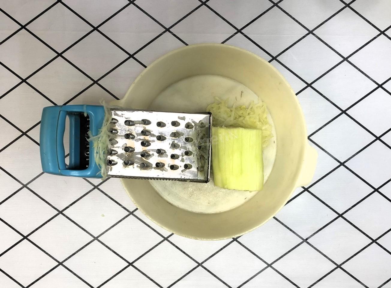 Натрите на крупной терке кабачок — ровно столько, чтобы заполнить стакан. Если кабачок молодой, его можно не чистить, просто тщательно вымойте, а если зрелый с толстой кожицей — обязательно срежьте кожу и удалите из серединки твердые семечки.