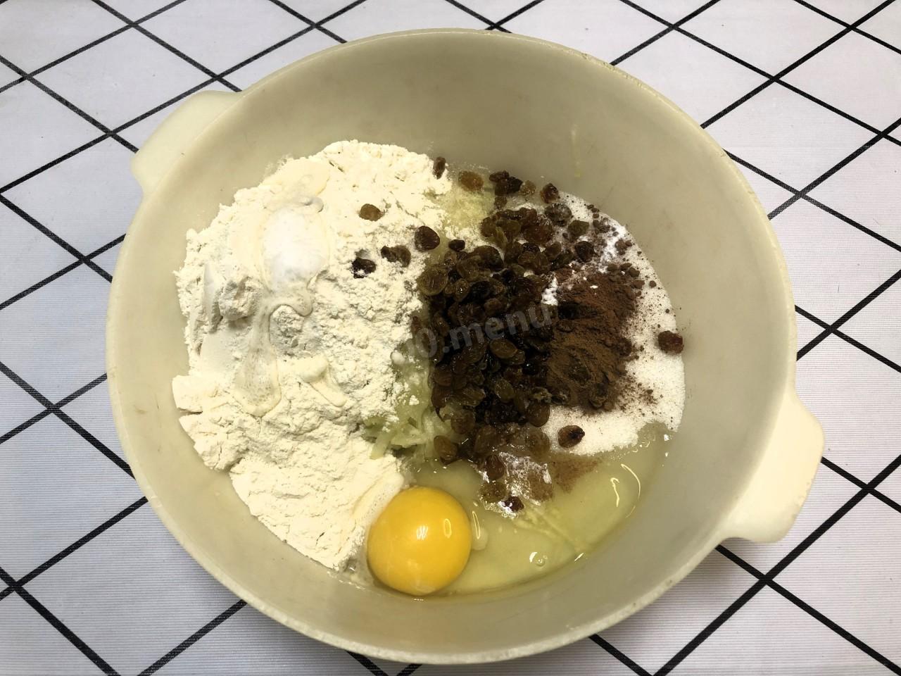 В большую миску к натертому кабачку добавьте сахар, яйцо, растительное масло, муку. Всыпьте сюда же соль, корицу, какао-порошок, ванилин, изюм и соду. Всё это как следует перемешайте. Кстати! При желании в тесто можно добавить, при наличии, 3 г тертой цедры лимона или апельсина, столько же тертого мускатного ореха и столько же разрыхлителя.