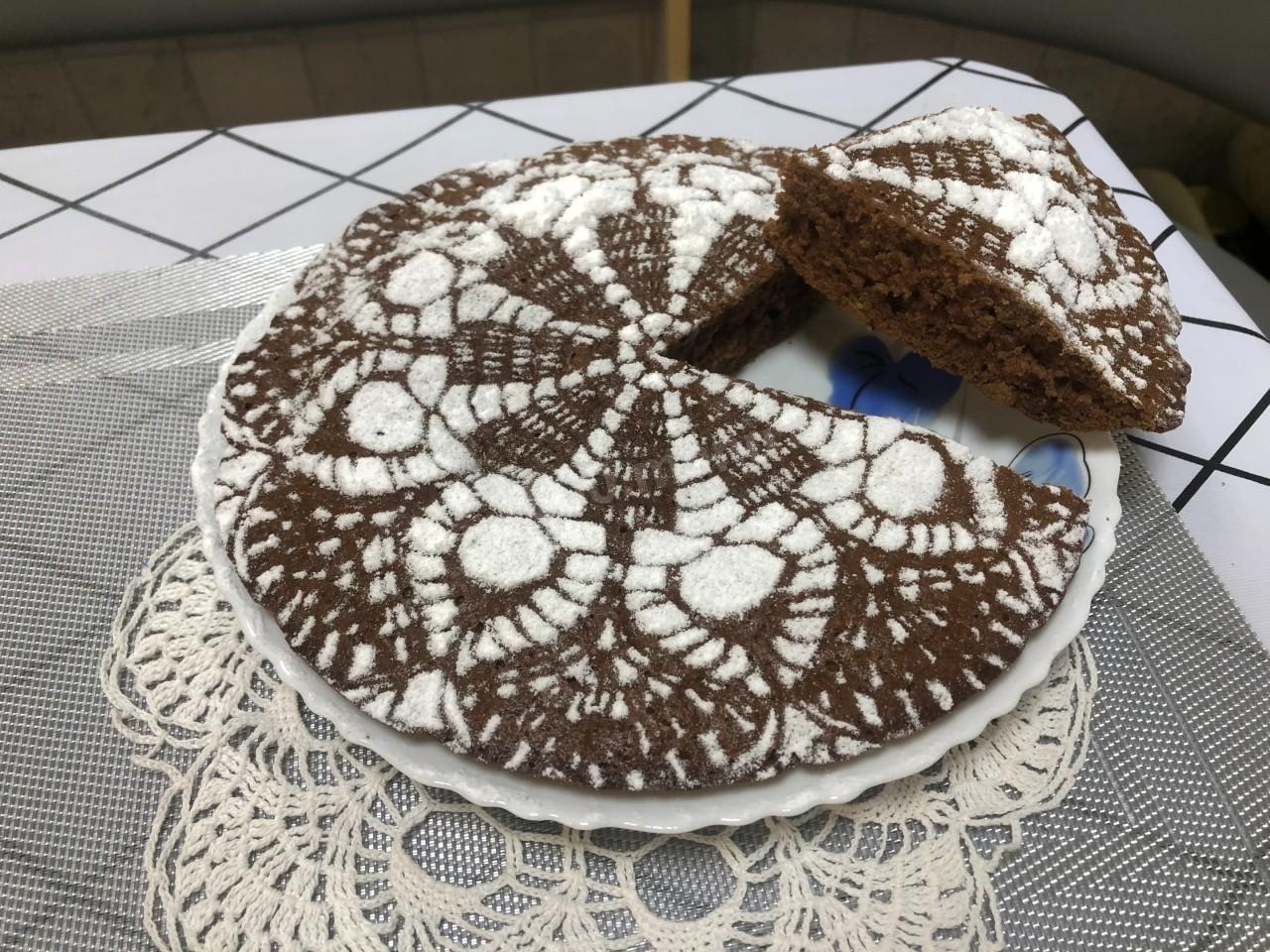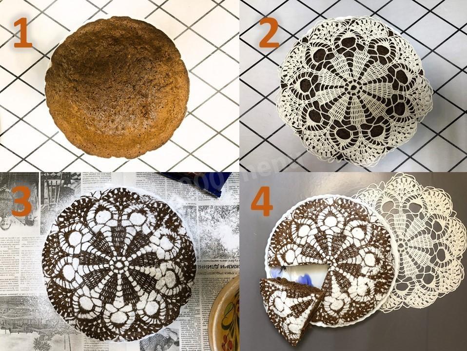 Остывший пирог украсьте сахарной пудрой, воспользовавшись трафаретом. Я для этого взяла чистую ажурную связанную крючком салфетку и положила ее на пирог, сверху обсыпала через сито сахарной пудрой. Аккуратно сняла салфетку. Получилось настоящее произведение искусства! Кстати, в моем домашнем арсенале имеется множество разных ажурных салфеток, так как я очень люблю вязать, и благодаря этому я могу украшать свою выпечку каждый раз новыми «узорами».