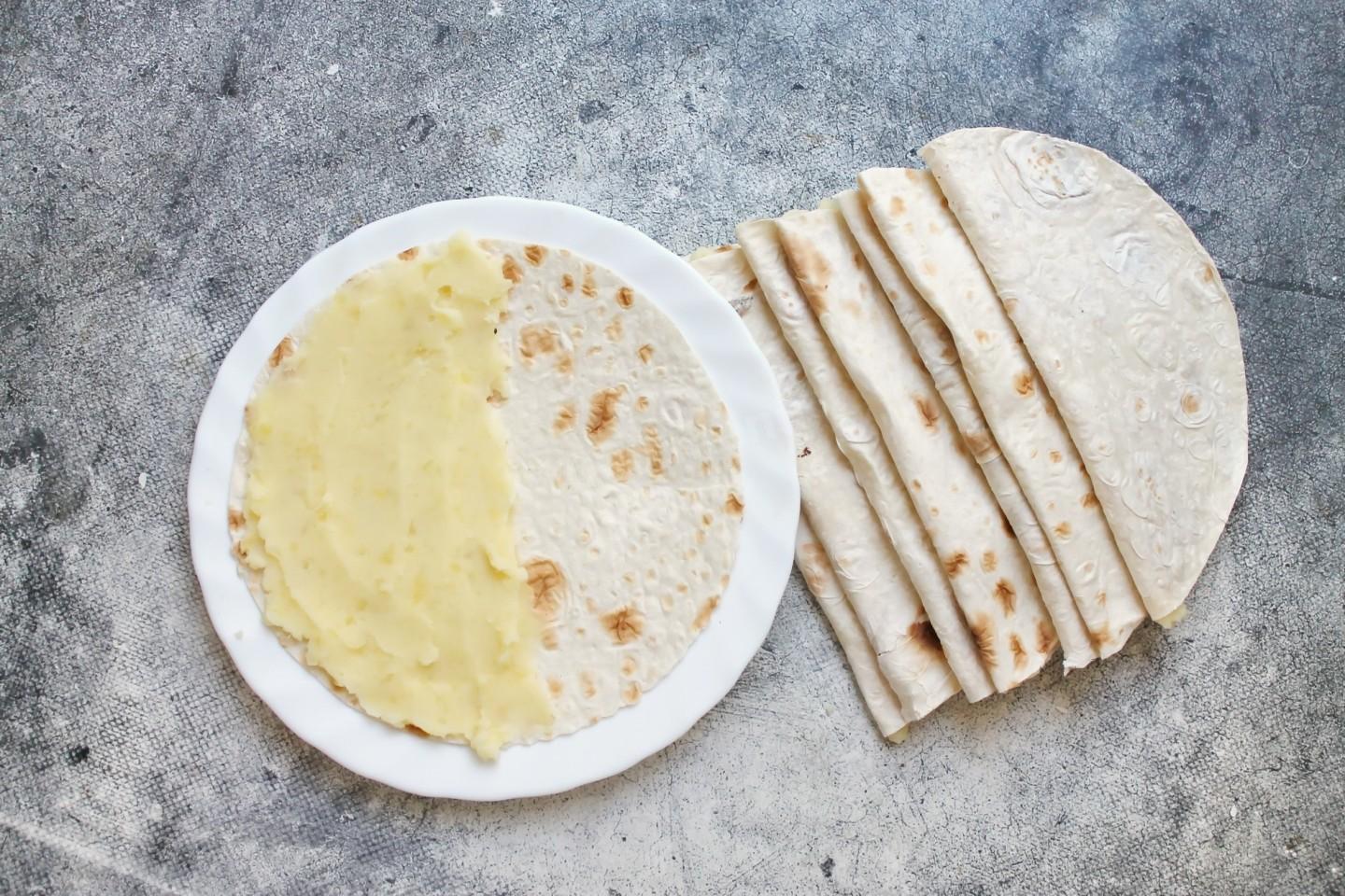 Разделите начинку на равные части по числу заготовок из лаваша. Нанесите на половину каждого круга картофельную начинку и закройте пустой стороной. Аккуратно прижмите, только чтобы слои соединились. Не старайтесь положить много пюре, вам будет сложно их перевернуть.