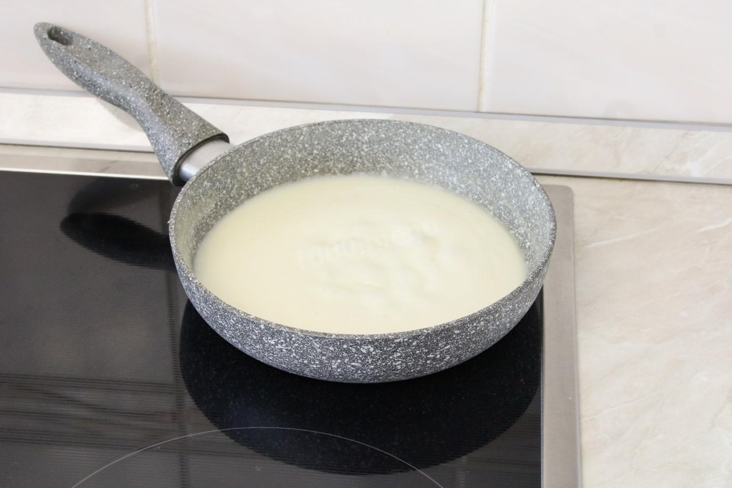 Постепенно, небольшими порциями влейте на сковороду примерно половину теплого молока, одновременно активно перемешивая массу до исчезновения комочков муки. Добавьте оставшееся молоко, соль и сахар, перемешайте. Доведите соус до кипения и варите на медленном огне, постоянно помешивая, до легкого загустения около 5 минут. Если в соусе всё-таки остались комочки, то процедите его через сито. Накройте соус пищевой пленкой и дайте немного остыть.