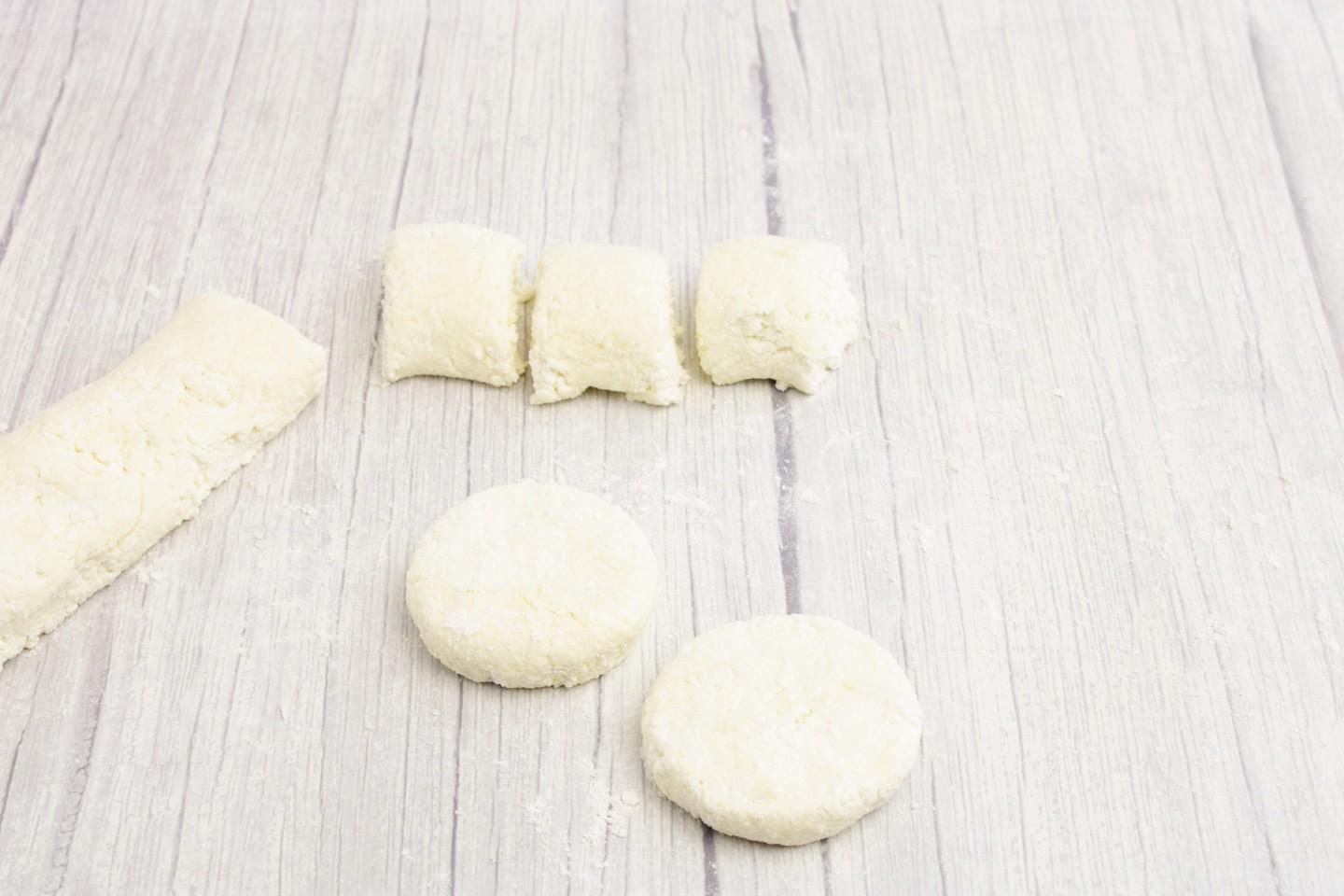 На присыпанном мукой столе сформируйте из теста толстую колбаску. Разрежьте тесто на порции. Каждую порцию теста обваляйте в муке и сформируйте круглый сырник в виде шайбочки.