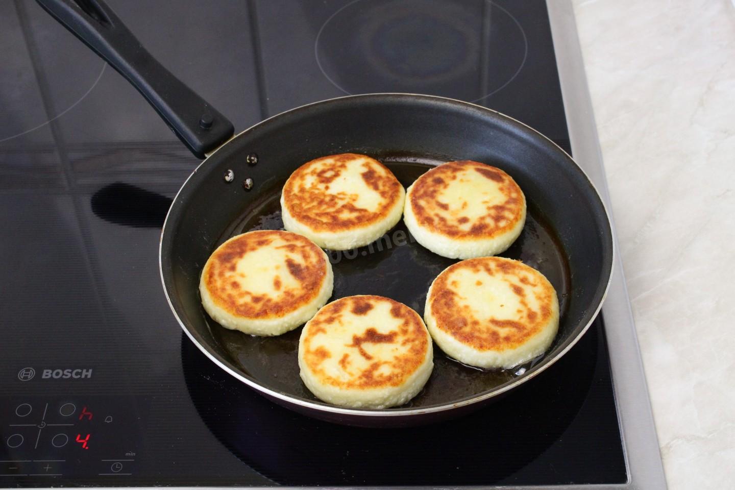 На сковороде разогрейте растительное масло. Обжарьте сырники на умеренном огне с двух сторон до румяности, ориентировочно по 4-5 минут с каждой стороны. С данной пропорции у меня получилось 9 небольших сырников. Выбрать сковороду, масло и определиться с температурой обжаривания помогут статьи по ссылкам после описания шагов.