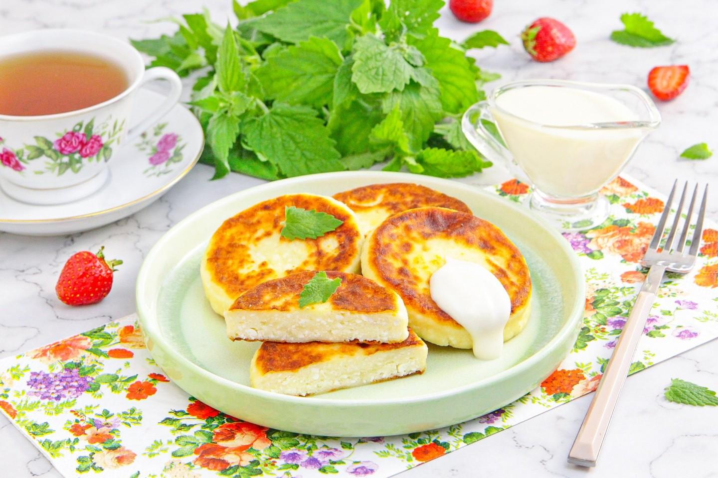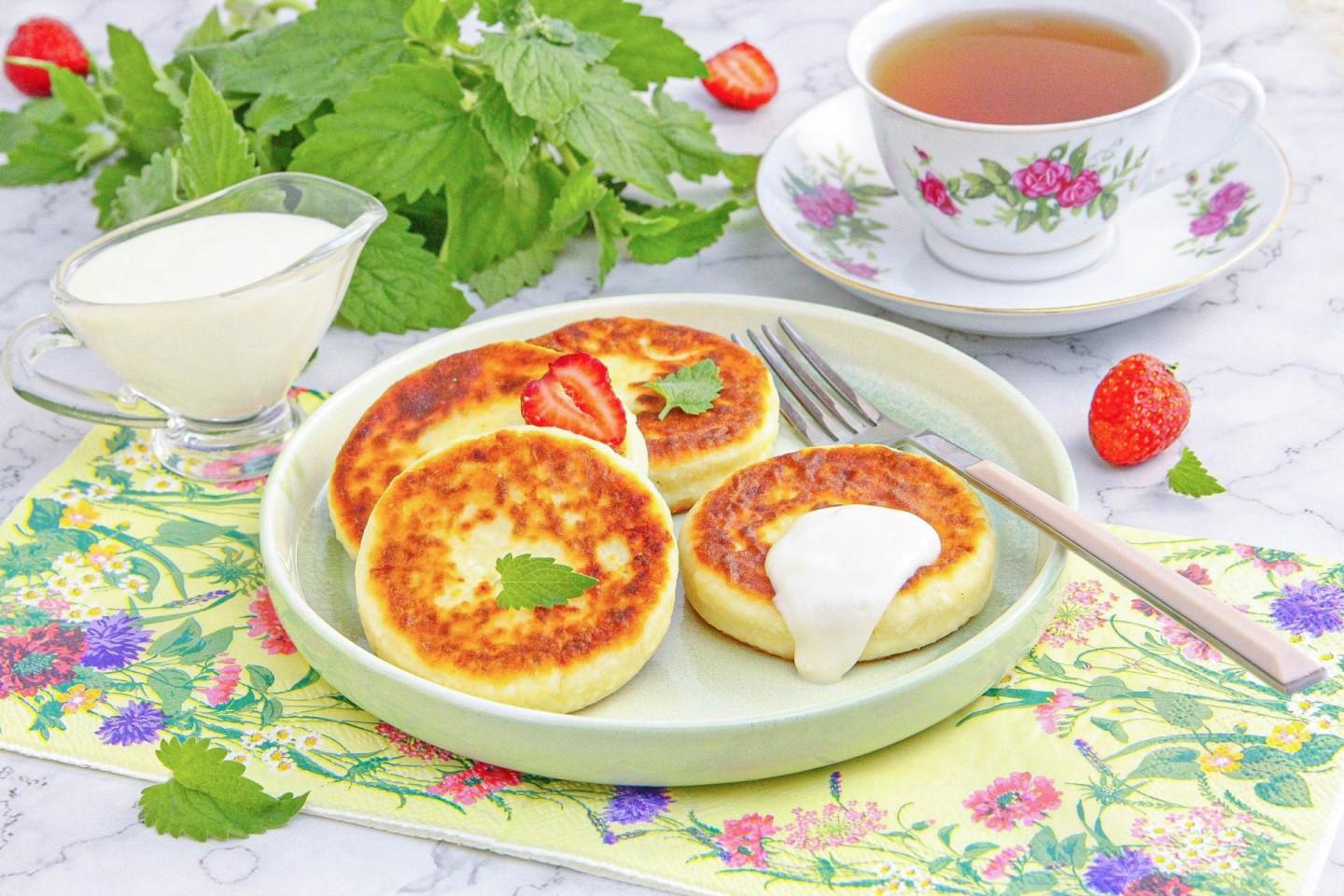 Классическая подача сырников как в детском саду — с молочным соусом. Также их можно подать со сметаной, вареньем (клюквенным, клубничным), медом, свежими ягодами или фруктовым пюре. Для взрослых отлично подойдет подача со взбитыми сливками и мятой.