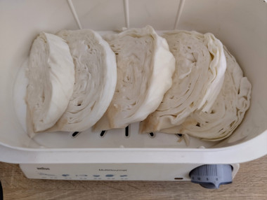 Включите на мультиварке режим "Варка на пару", время установите 10 минут. После сигнала о готовности проверьте капусту на мягкость. Если она еще будет не готова, прибавьте время. Это будет зависеть от сорта капусты и толщины нарезки. Я добавила еще 4 минуты. Время приготовления указано приблизительно, ориентируйтесь на особенности работы вашей техники.