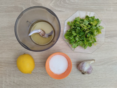 Как сделать зеленый соус для белокочанной капусты на пару? Для этого в стакан блендера нарвите веточки заранее вымытой и обсушенной зелени, убирая толстые стебли. Я взяла укроп, но также хорошо подойдет петрушка и базилик. Влейте растительное масло без запаха, положите очищенный зубчик чеснока. Выдавите из лимона немного сока. Всыпьте соль. Пробейте продукты блендером до однородности.