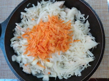 Добавьте к капусте нарезанный лук и морковь, перемешайте. Закройте сковороду крышкой и продолжайте тушить овощи с курицей на небольшом огне ещё минут 20.