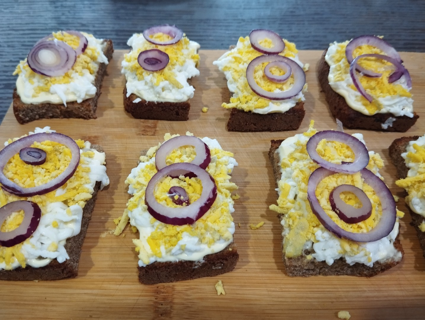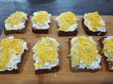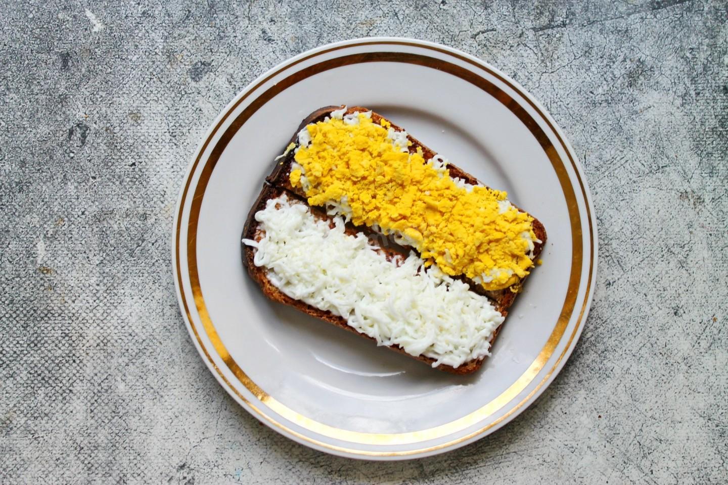 Смажьте одну сторону кусочков тонким слоем майонеза, поперчите или посыпьте любимыми специями. Майонез без труда можно приготовить дома, а подходящий рецепт найдете по ссылке под рецептом. На майонез положите сначала белок, разровняйте и немного прижмите. Сверху уложите тертый желток и так же прижмите, чтобы не сыпался.