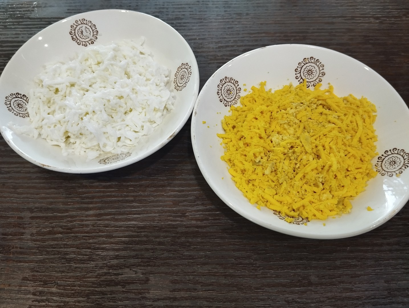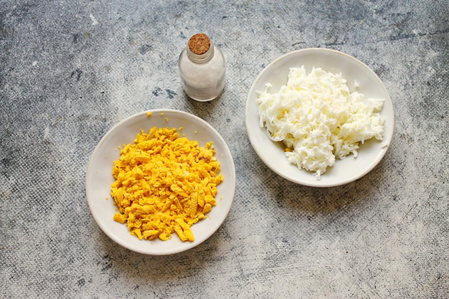 Яйцо почистите, разделите на белок и желток. Натрите сначала белок на средней терке, а за тем желток на крупной терке. Белок и желток посолите и перемешайте. А подробнее о работе с привычной кухонной тёркой читайте в материале по ссылке под шагами.