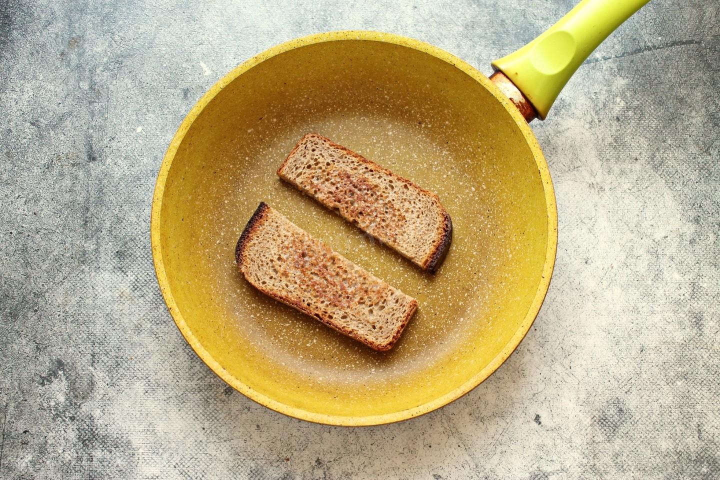 Сухую сковороду поставьте на средний огонь и разогрейте. Разрежьте кусок на две части и положите черный хлеб на сковороду, обжарьте с двух сторон до румяной корочки. На это уйдет примерно от 30 до 60 секунд. Снимите хлеб на тарелку и полностью остудите. А какая сковорода лучше всего подойдет для приготовления, читайте в статье под шагами.