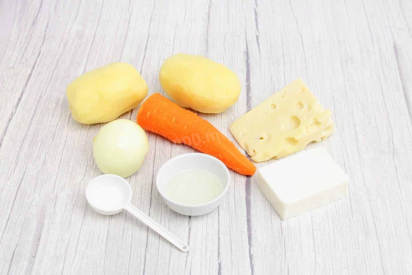 Подготовьте необходимые продукты. Вместо воды можете использовать овощной бульон. Растительное масло используйте без запаха. Овощи вымойте с помощью жесткой губки или щётки, очистите и ополосните. Твердый сыр можно взять любой, главное, чтобы он был вкусный, без заменителей молочного жира и хорошо плавился. О выборе и заменах сыра, а также всё о сортах картофеля, читайте подробнее в статье по ссылке ниже.