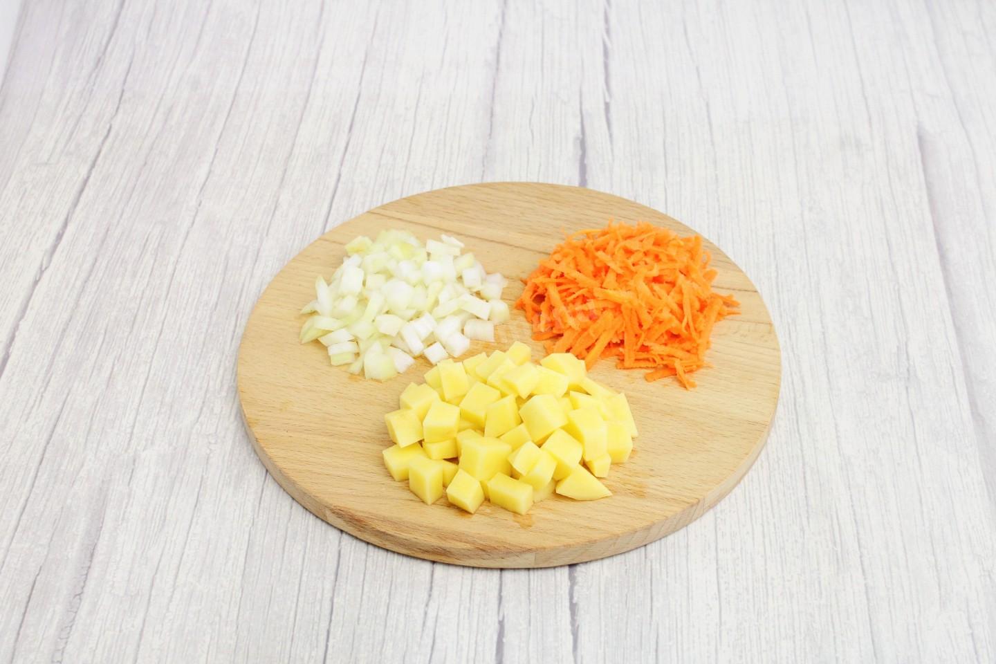 Морковь натрите на крупной терке. Подробнее о работе с привычной кухонной теркой читайте в статье по ссылке ниже. Лук нарежьте мелкими кубиками. Картофель нарежьте небольшими кубиками. Форму и размер нарезки овощей можно сделать любую, они будут влиять только на продолжительность приготовления. Чем крупнее нарезаны овощи, тем дольше они будут вариться.