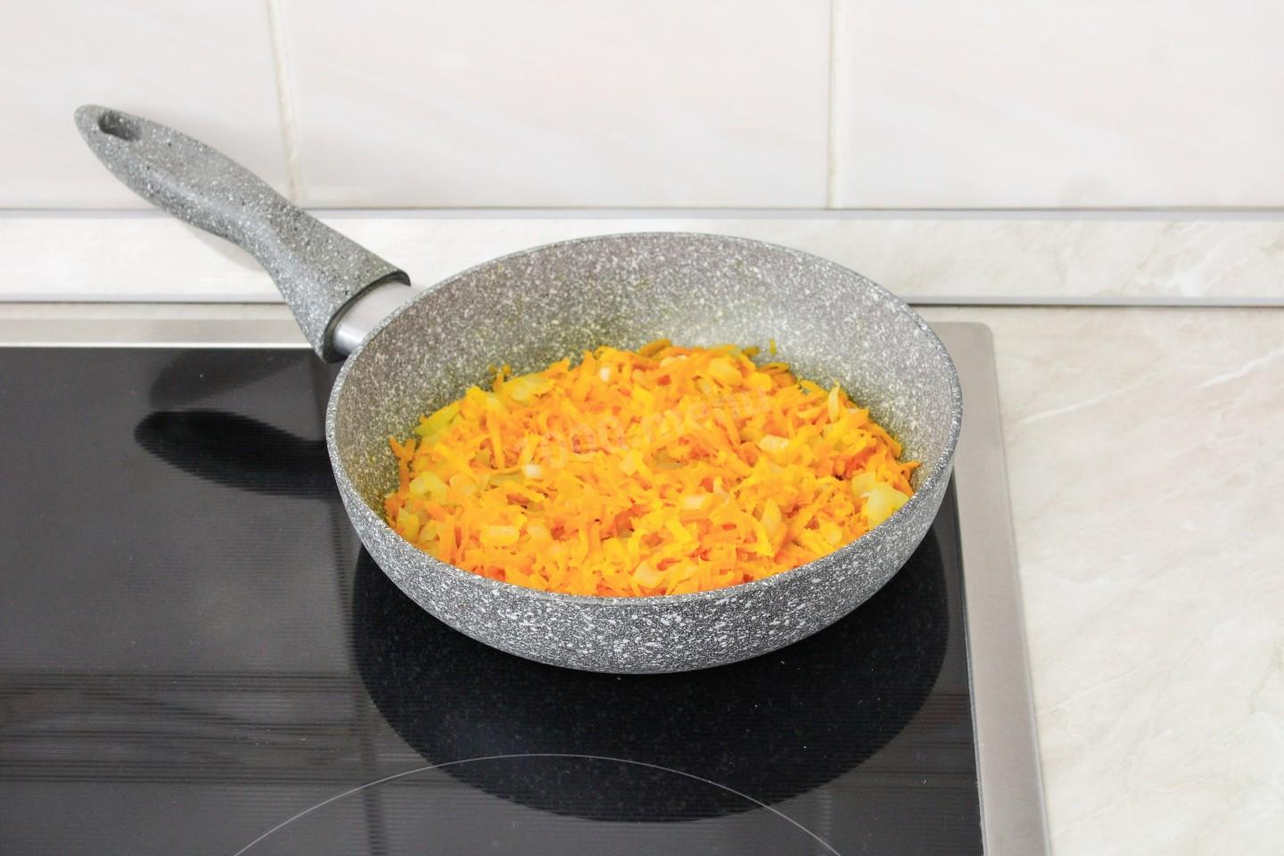 На сковороде разогрейте растительное масло. Обжарьте лук и морковь на среднем огне, периодически помешивая, примерно 5-7 минут. Выбрать сковороду, масло и определиться с температурой обжаривания помогут соответствующие статьи, ссылки под шагами.