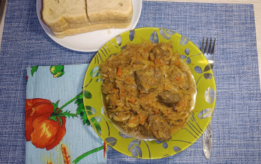 Накройте сковороду крышкой и тушите капусту с печенкой 25-30 минут до готовности. Приятного аппетита!