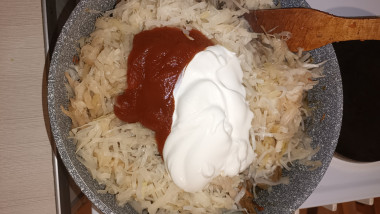 Выложите сметану и томатную пасту. Влейте 150 мл горячей воды и все тщательно перемешайте.