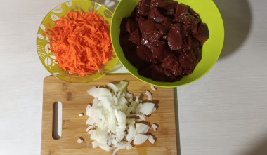 Тем временем подготовьте остальные ингредиенты. Из печени удалите крупные протоки, сгустки крови, если они есть. Тщательно промойте. Нарежьте средними кусочками.