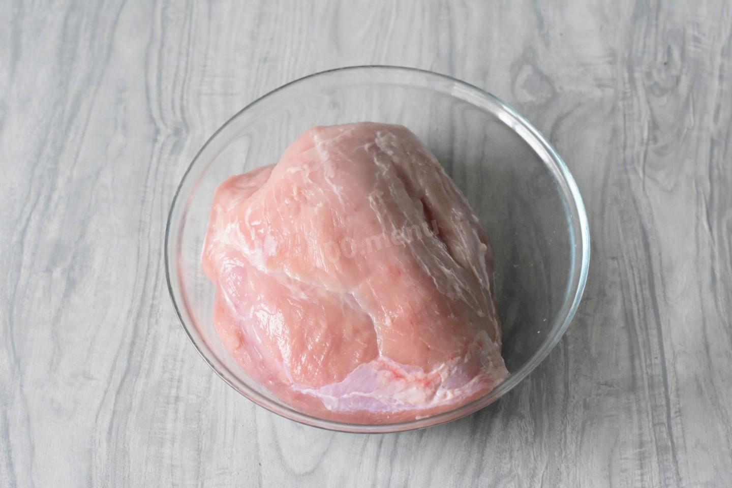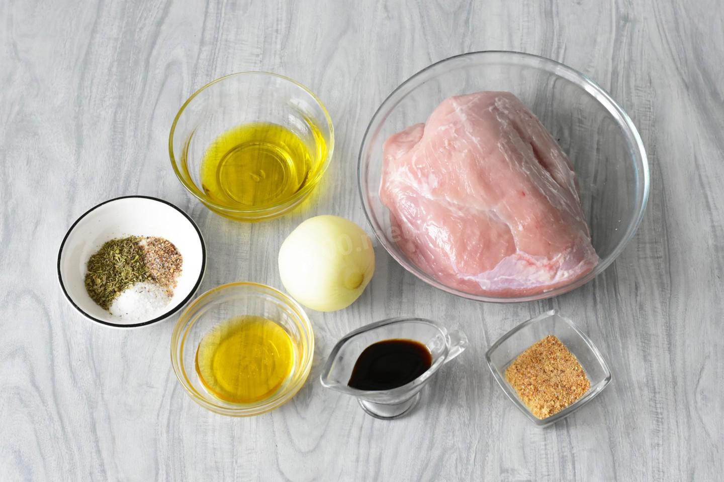 Подготовьте необходимые ингредиенты. Замороженное мясо предварительно разморозьте на нижней полке холодильника. О тонкостях правильной разморозки читайте в статье по ссылке в конце рецепта. По этому рецепту можете также приготовить крупное филе индейки или говядины. Специи можете подбирать по своему вкусу.