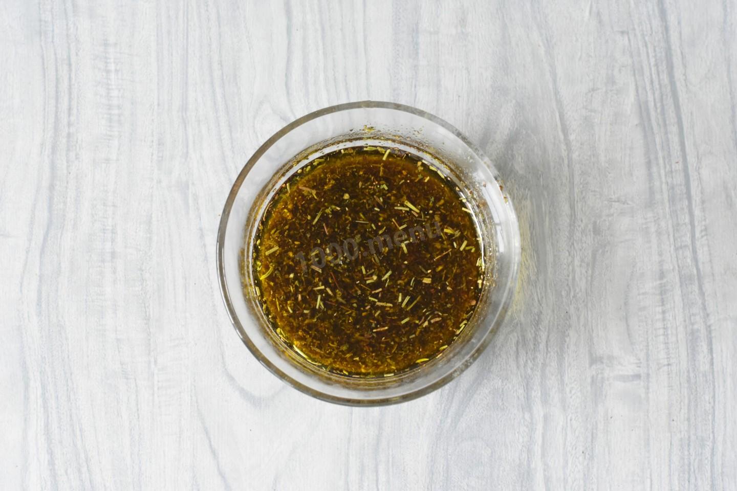 В мисочке соедините оливковое масло, соевый соус, сухой чеснок, итальянские травы, соль и перец. Все тщательно перемешайте.
