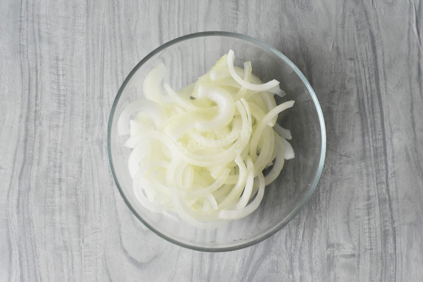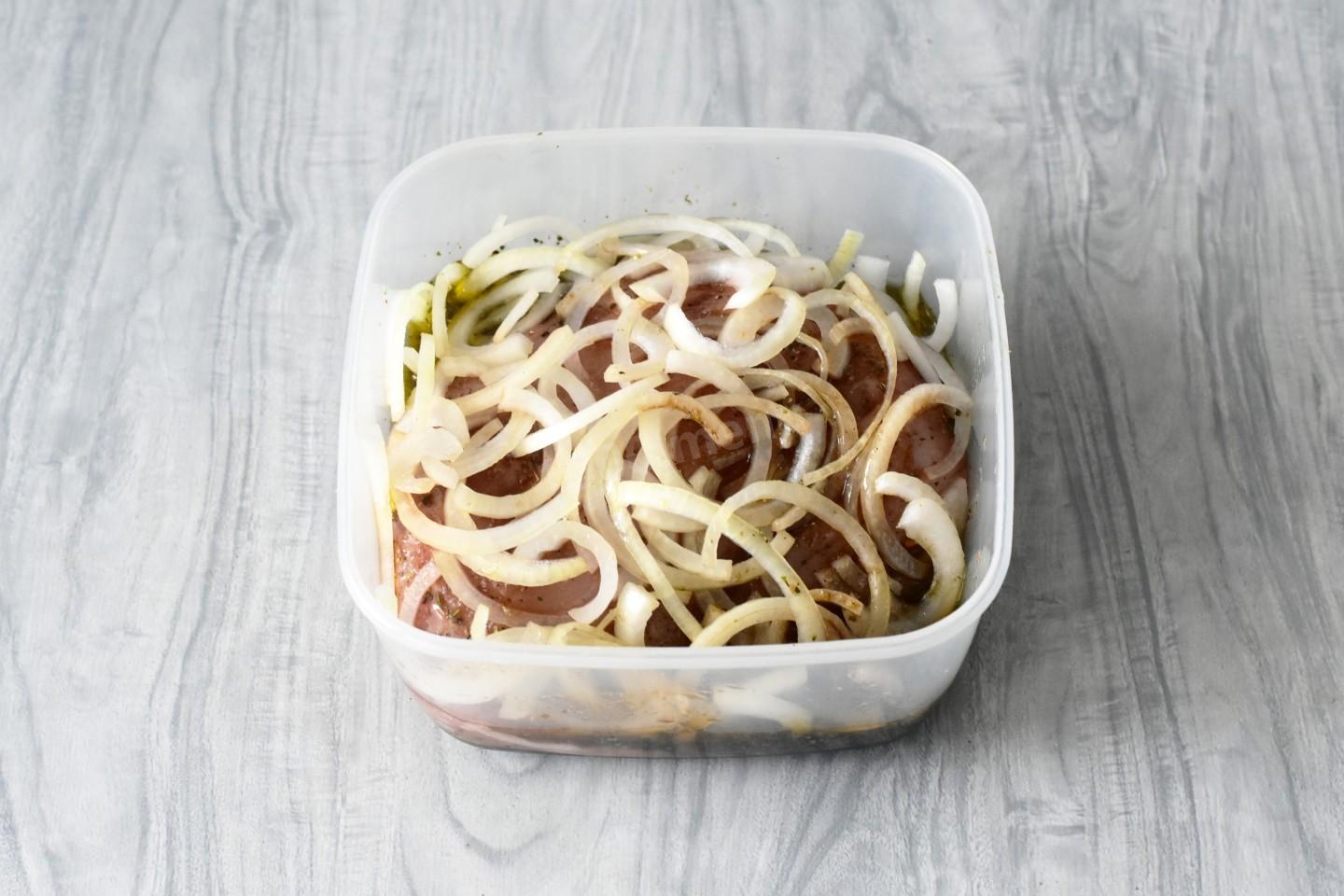 Луковицу очистите и нарежьте полукольцами. Мясо натрите со всех сторон маринадом и выложите в контейнер с крышкой. Сверху выложите нарезанный лук.