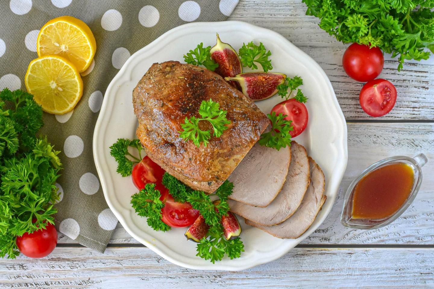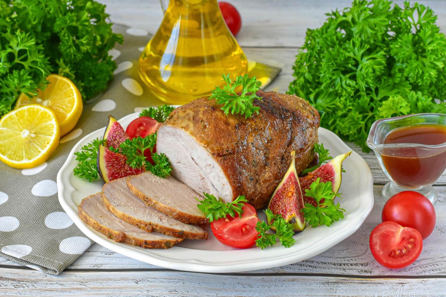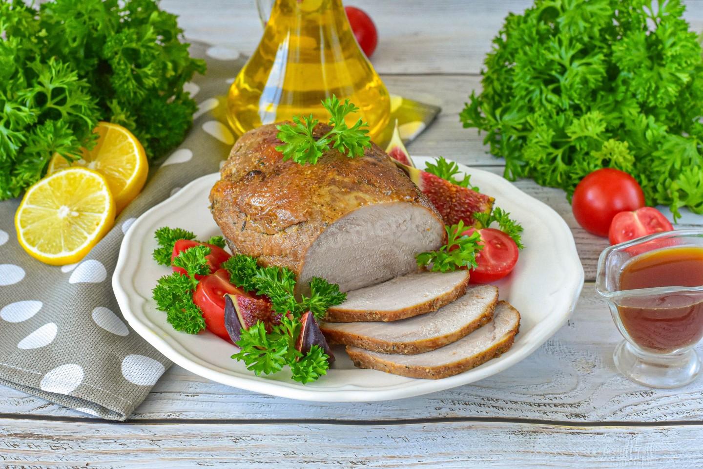 Буженину, запеченную в аэрогриле, переложите на тарелку, украсьте зеленью и подайте к столу. Приятного аппетита!