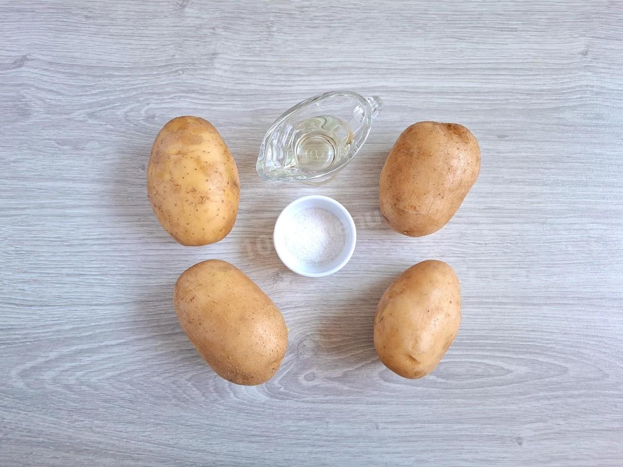 Подготовьте необходимые ингредиенты. Выбирайте клубни примерно одного размера, тогда картошка получится красивее и равномернее прожарится. Масло берите рафинированное, с высокой температурой дымления, так как картошка будет запекаться при высоких градусах. Полезную информацию о выборе картофеля и масла читайте под описанием рецепта. Кроме соли можно взять любые специи на ваш выбор.