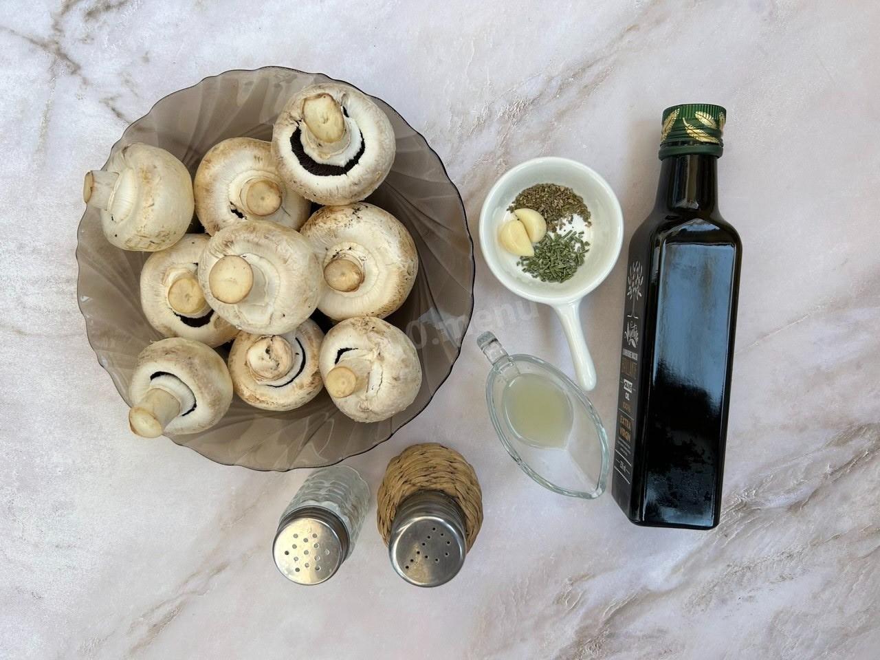 Для начала подготовьте все необходимые ингредиенты. Свежие шампиньоны берите среднего размера, но учитывайте, что при запекании они немного уменьшатся.