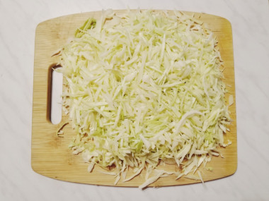 Капусту вымойте и тонко нашинкуйте, обходя плотные части листьев возле кочерыжки. Вес нарезанной капусты должен быть примерно 1 кг, поэтому покупайте вилок с запасом.