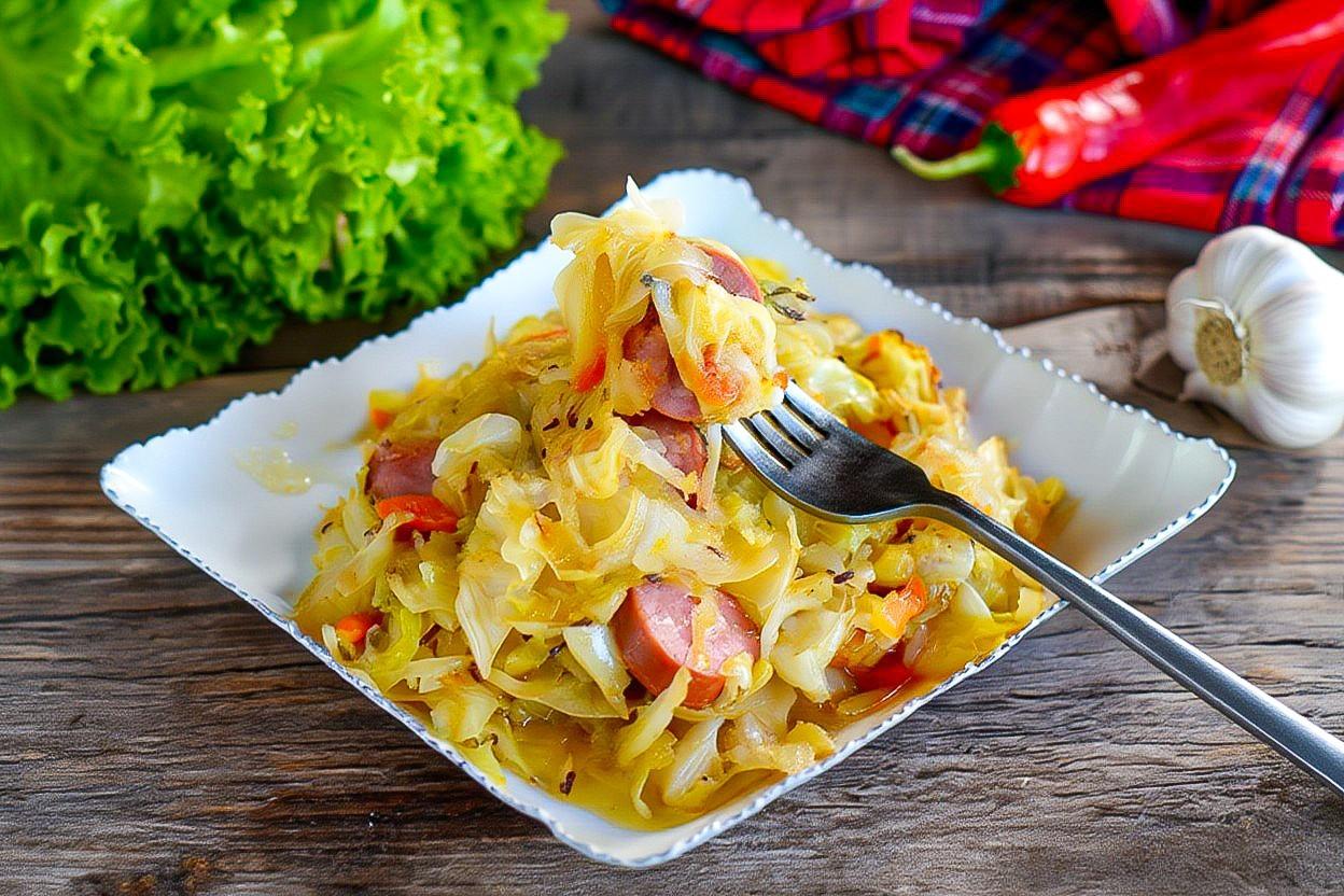 Давно хотела приготовить тушеную капусту по-немецки. Ингредиенты такие все вкусные, очень любопытно было, что же получится в итоге. Для этого блюда взяла домашнюю квашеную капусту, она не сильно кислая, промывать не пришлось. Когда обжаривала ее с луком и сосисками, поняла, что сосиски скорее тушатся. Поэтому выловила их из общей массы и отодвинула на другую сторону сковороды. Таким образом сосиски обжарились до румяности, потом все соединила. Воспользовалась советом автора и посолила свежую капусту сразу после закладки в сковородку. Действительно, капуста быстрее дала сок, осела и времени на приготовление ушло меньше, чем обычно. Тмин мы не любим, заменила его на копченую паприку и чесночный порошок. Получилось очень ароматно) Блюдо нам понравилось, жареная капуста с сосисками невероятно вкусна! Кислинка от квашеной капусты и специи придают всему блюду очень приятный пряный вкус, а поджаренные сосиски источают очень аппетитный аромат! Всем советую попробовать!