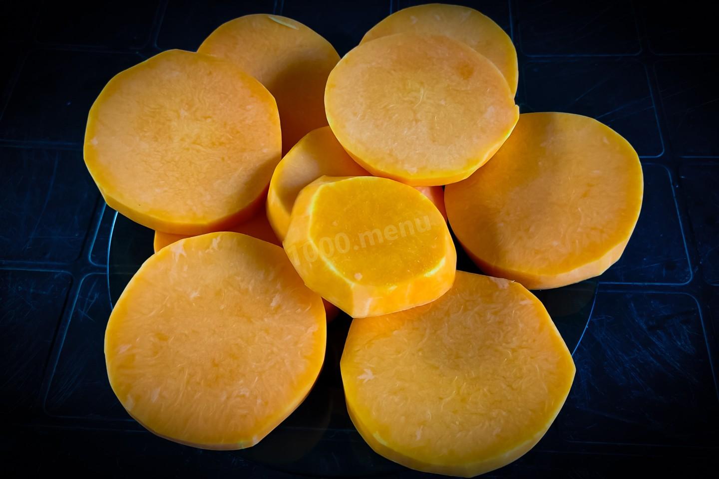 Нарезать тыкву кольцами. Я нарезаю по 1 сантиметру шириной. Можно конечно и на крупной тёрке натереть, но мне лично так больше нравится, когда тыква нарезана.