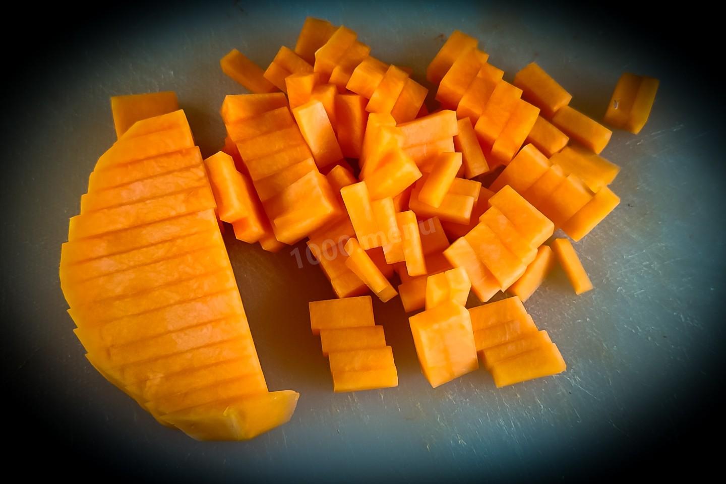 Теперь тыкву надо нарезать сначала на полоски по 5 - 7 мм, потом ещё раз поперёк полосок нарезать по 5 - 7 мм.