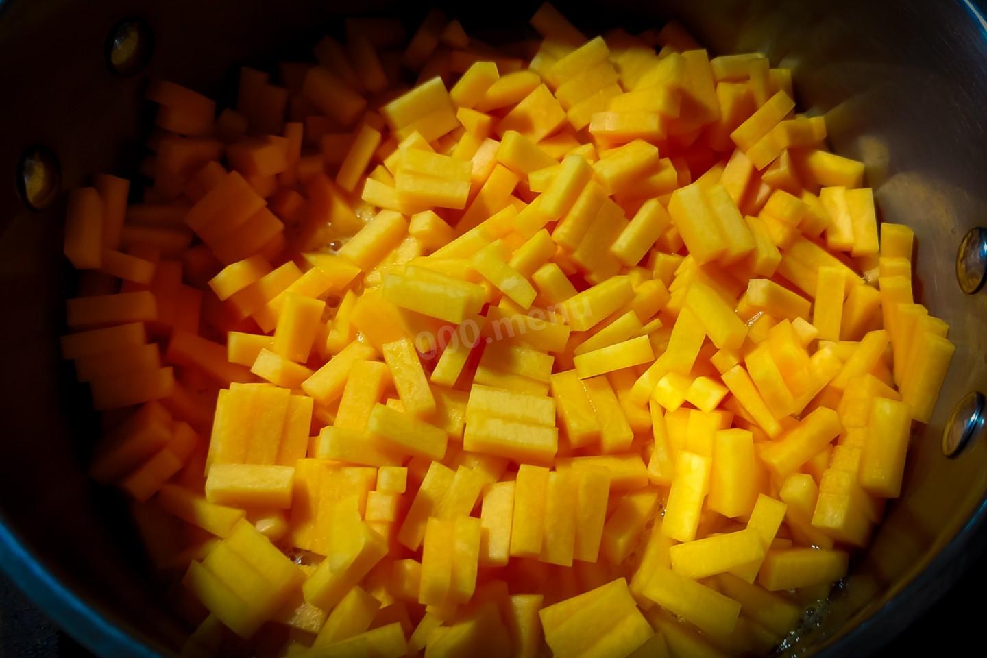 В кастрюлю (пятилитровая в моём случае) налить воду и закипятить её. Как только вода закипит, пересыпать к ней всё нарезанную тыкву, закипятить, уменьшить огонь на минимум, накрыть кастрюлю крышкой и томить тыкву в течении 30 минут.