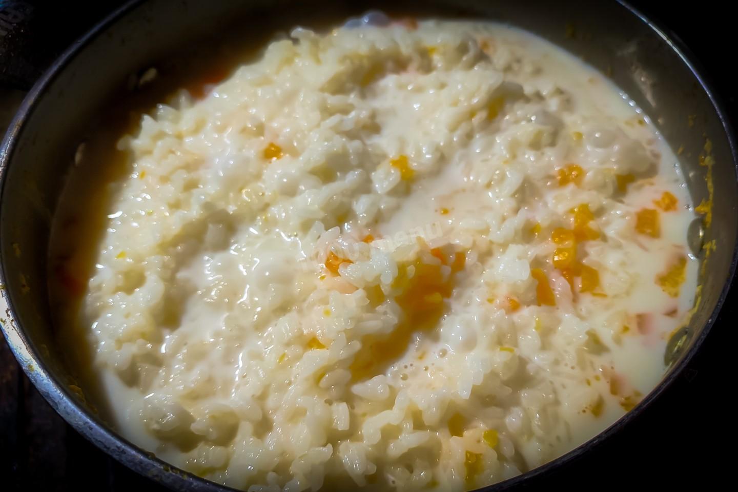 Когда молоко прокипит 5 минут, снять крышку и переложить рис в кастрюлю (рис без воды, воду перед перекладыванием слить). Рис не перемешивать с тыквой, а только равномерно распределить по верху! Накрыть крышкой и томить на медленном огне после закипания 30 минут.