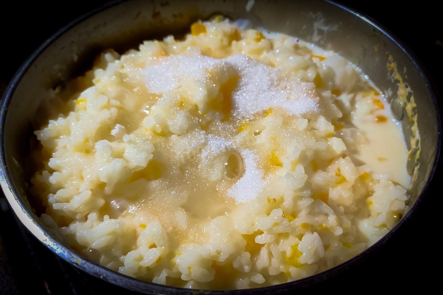 Рис не нужно перемешивать с тыквой во время томления для того, чтоб он не прилип ко дну. Иначе потом придётся приложить не мало усилий, чтоб отмыть дно кастрюльки. А ещё сахар по той же причине не следует добавлять до момента отключения огня под кастрюлькой всё по той же причине. Сахар можно добавить в конце приготовления или перед подачей на стол. А ещё можно при подаче на каждую порцию сверху положить по маленькому кусочку сливочного масла.