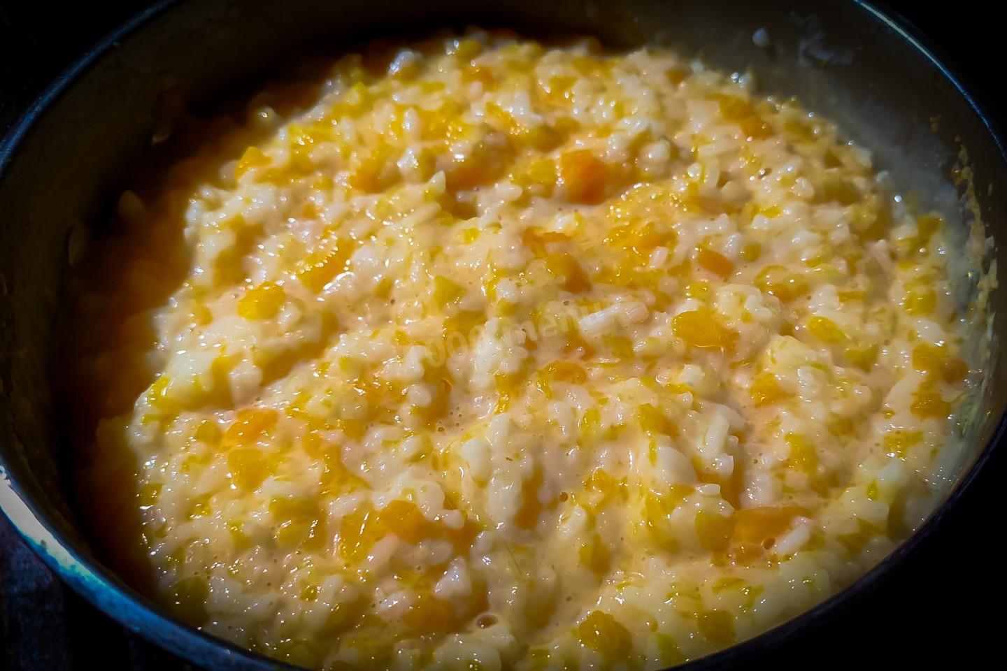В течении 30 минут томления риса нужно дважды, каждые 10 минут, аккуратно перемешать только верхний рисовый слой. Тыква должна оставаться внизу!