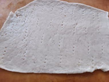 Подошедшее тесто раскатайте на присыпанном мукой столе в прямоугольный пласт. Сверху слегка присыпьте тесто крахмалом.