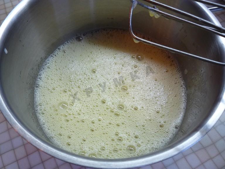 В чашке смешайте яйца, сахар, ваниль, ликер и взбейте в пышную пену. Добавьте масло и еще раз взбейте.