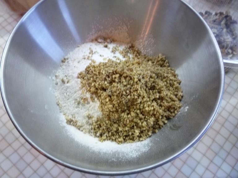 Смешайте муку, разрыхлитель, орехи и добавьте в яично-сахарную смесь.