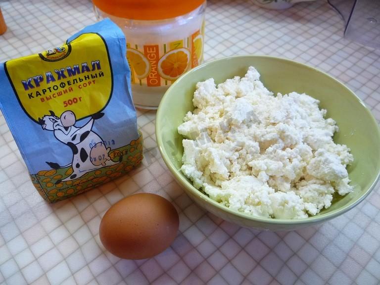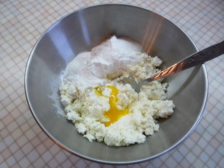 Смешайте творог, яйцо, сахарную пудру и крахмал. Хорошо перемешайте. Должна получиться густая масса.
