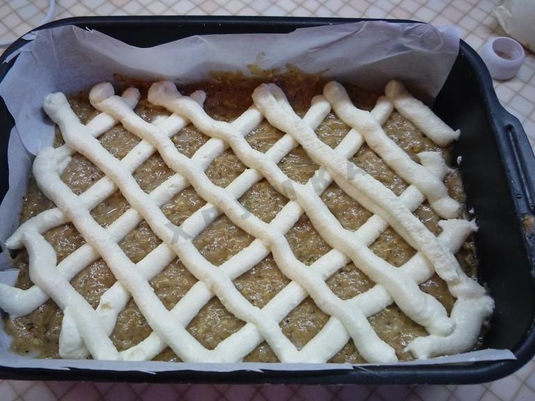 Форму заселите бумагой для выпечки. Вылейте туда тесто и разровняйте ложкой. Теперь с помощью кондитерского мешка сделайте сетку из крема на тесте. Можно использовать плотный кулек. Выложите в него крем, обрежьте кончик и выдавите также крем.