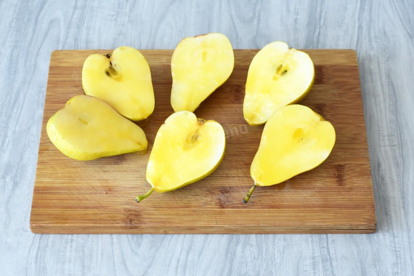 Груши вымойте, обсушите. Каждую грушу разрежьте вдоль на две половинки. Удалите семена. Груши выбирайте спелые и плотные, не мягкие. Мягкие груши быстро потеряют форму. Сорт груш берите любой. Чем ароматнее и вкуснее будут фрукты, тем лучше. У меня груши сорта Форелл. А вы пробуйте под свой вкус.