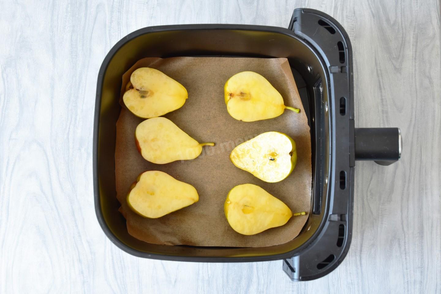 Смажьте внутреннюю часть груш медово-ванильным соусом. Чашу аэрогриля застелите пергаментом. По желанию можете использовать силиконовую или алюминиевую форму для запекания. Выложите груши срезом вверх.