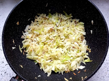 Обжарьте капусту в течение 5-7 минут, помешивая ее лопаткой. Точное время определяйте по своей плите и используемой посуде.