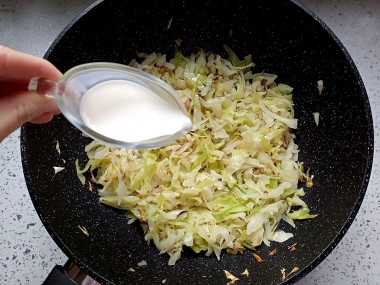 Капусту со сливками я приготовила в качестве начинки для пирожков. Состав очень простой и процесс не сложный. Капуста у меня сочная и мягкая, нарезала ее лапшой. Сливки взяла 10%, во время тушения добавила еще порцию. Специи не использовала, только посолила.